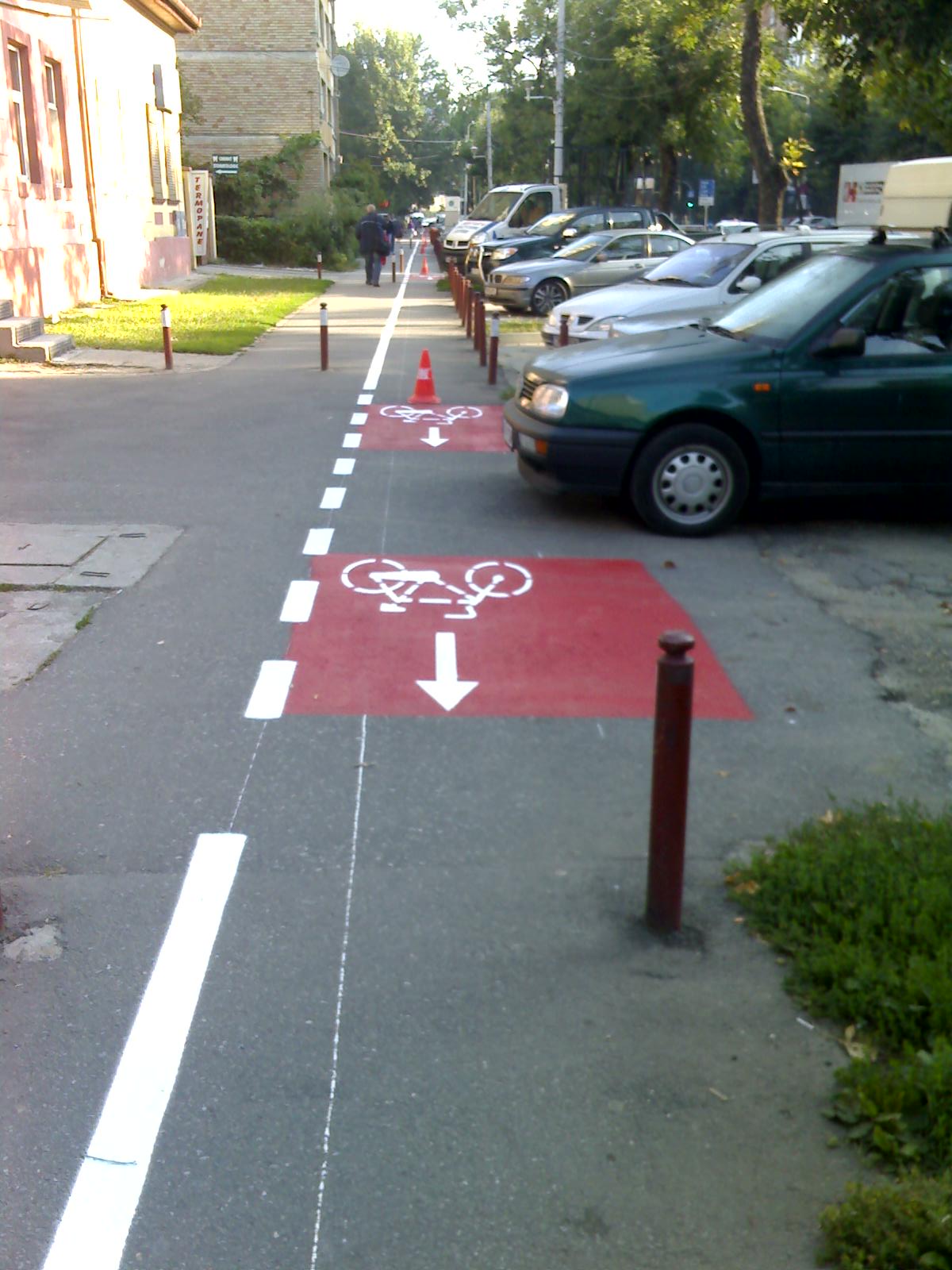 Imi place că au pus stâlpii din imaginea de mai jos. Acolo erau tot timpul maşini parcate şi trebuia chiar să mă dau jos de pe bicicletă. Acum doar mă asigur şi trec mai departe.